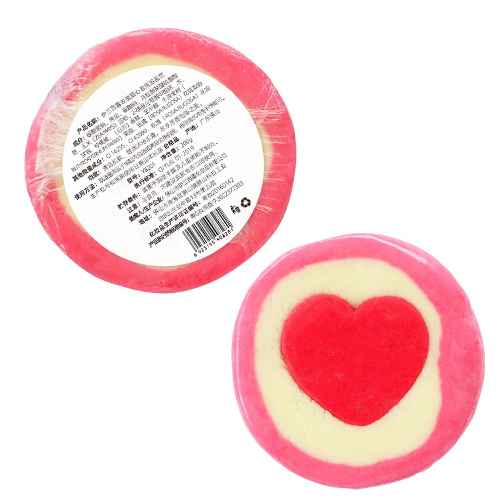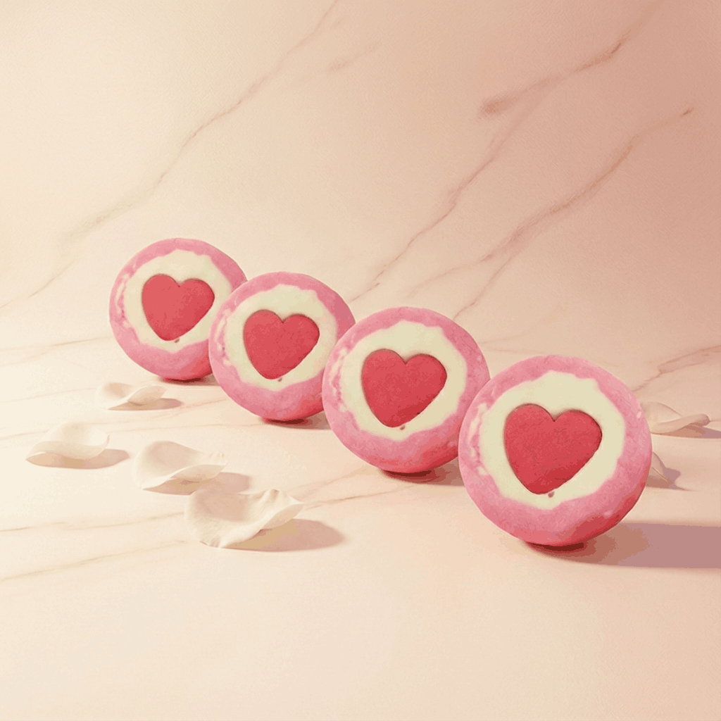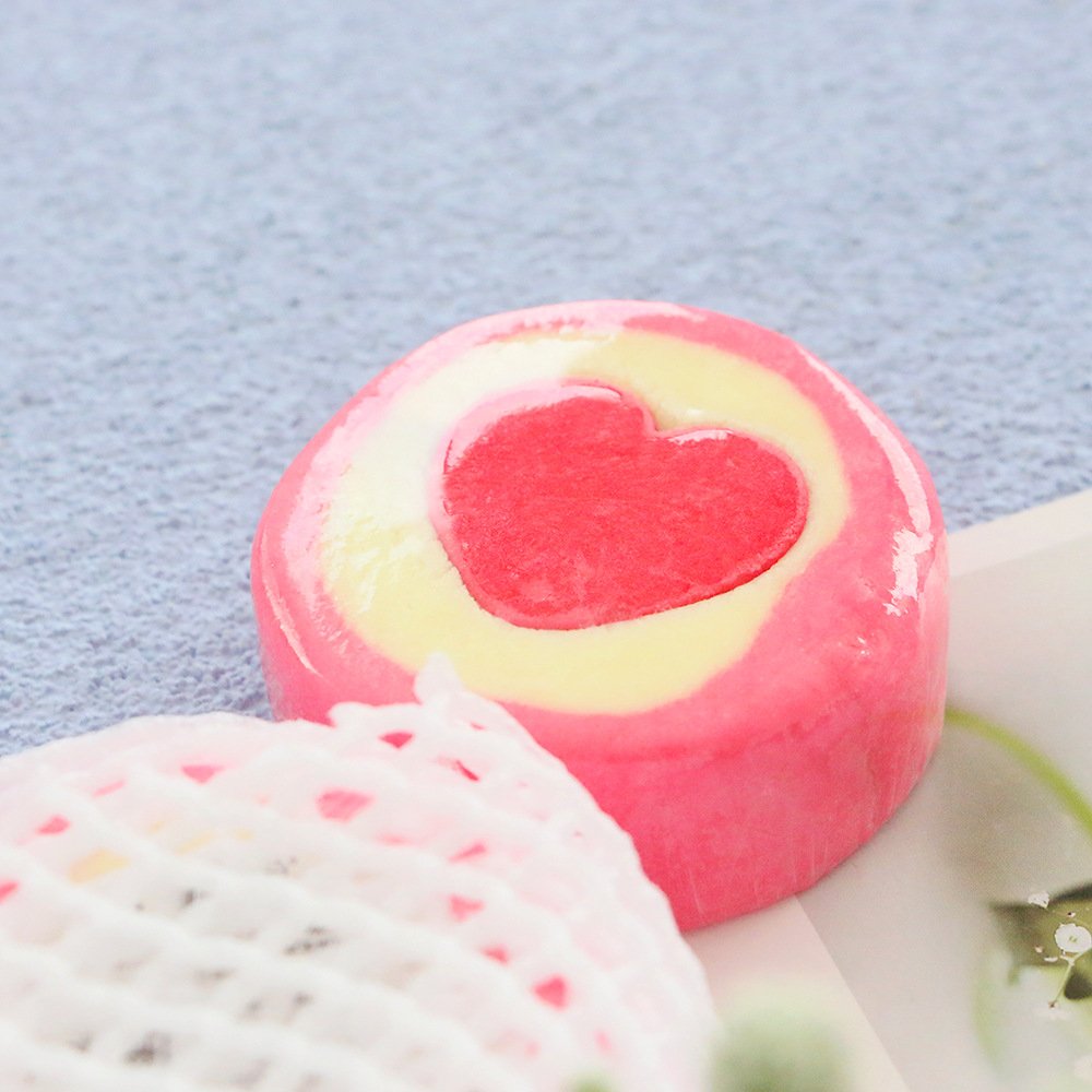 1. Crumble the charming heart-shaped bar under tap water to unleash a cloud of fragrant, rosy foam.